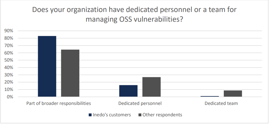 70% of respondents manage OSS vulnerabilities as part of their broader responsibilities, indicating a trend towards integrating this task within existing roles rather than assigning dedicated personnel or teams. (82.95% of Inedo’s customers and 64.38% of other respondents.)