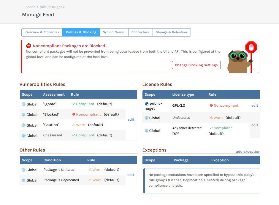 SCA (Software Composite Analysis) policies in ProGet let you define what “compliant” means for open-source packages in various contexts. These policies let you set rules regarding licensing, vulnerabilities, and other things like deprecation. When set, they will block downloads or usage of “noncompliant” packages. You can also create exceptions for known packages and “warn” for packages that are somewhere in-between.