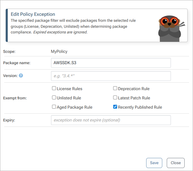 That means that, if your developers rely on that package, there’s no sense in enforcing a “newly published” rule, as they will constantly be requesting exceptions to use the latest version. In this case, specifying a Rule Exceptions for AWSSDK.S3 makes sense.