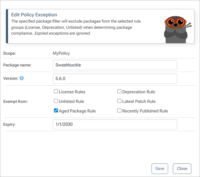 Before defining compliance rules, think about how you’ll handle exceptions. ProGet allows you to exempt packages by name and version, but someone will have to decide which exceptions are appropriate. And then, decide which feature to use for that exception. There are three options: