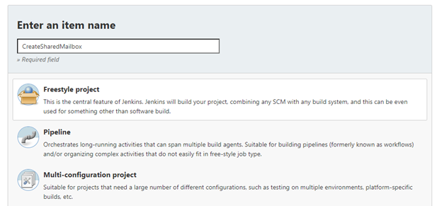 Each PowerShell script you want to run will be its own Jenkins project. For this explanation, we’re going to use CreatedSharedMailBox.ps1.