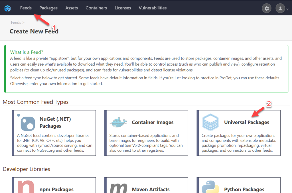 Once ProGet is running on your machine, click on Feeds in the ribbon and set up a Universal Package feed.