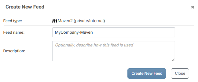 For this example, we’ll use ProGet. First, download and install ProGet on Windows or Linux. In ProGet click Feeds in the ribbon and set up a Maven Feed.
