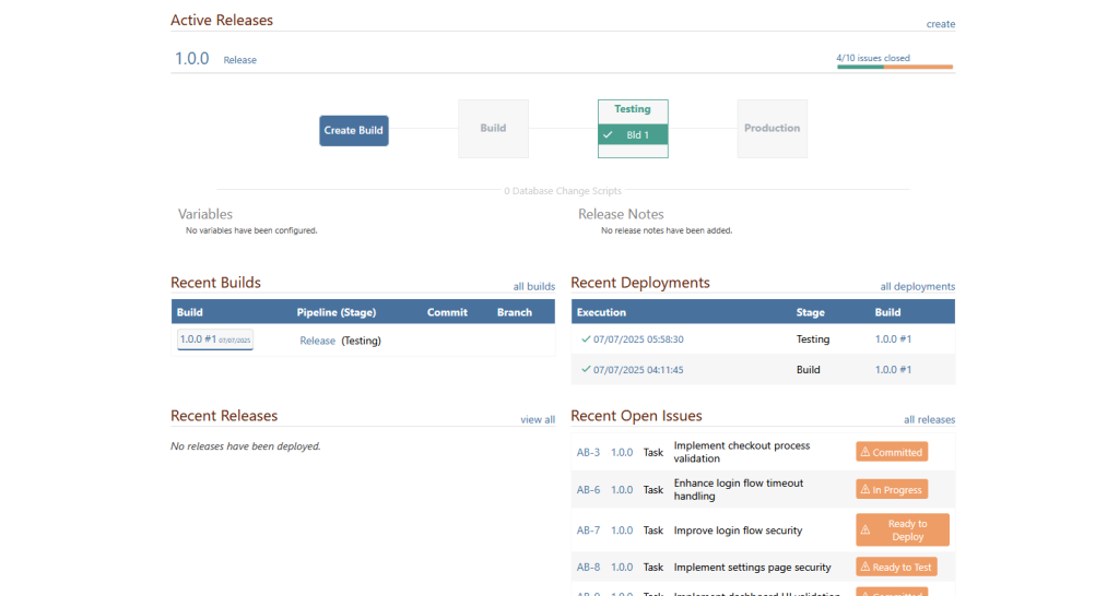 At a glance, you can see a clear overview of the release’s current state, including all associated builds and the stage of the deployment pipeline they’re in: development, testing, or production. The interface makes it easy to track every change tied to the release, along with its pipeline stage, Git branch, and issue status, giving everyone a complete, up-to-date picture of what’s happening and what needs attention.
