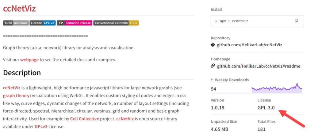 Here’s an example of a “GPL3.0” licensed package from npmjs.org, ccNetViz: