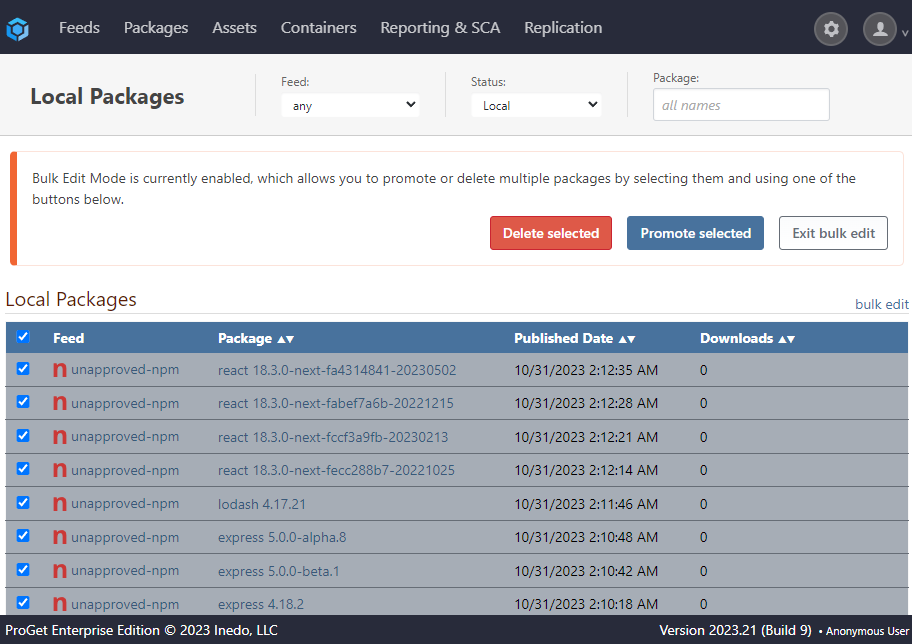 Note that bulk promotion only works with packages that are local or cached in ProGet. This means the person reviewing packages would connect his local npm to the unapproved feed, install these packages locally, and then verify them. Once verified, the developer would go back to ProGet and bulk promote the cache packages.