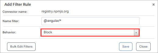 Simply navigate to “Feeds” and select “Connectors”. From here select a connector such as “registry.npmjs.org” and select “Add Filter”.