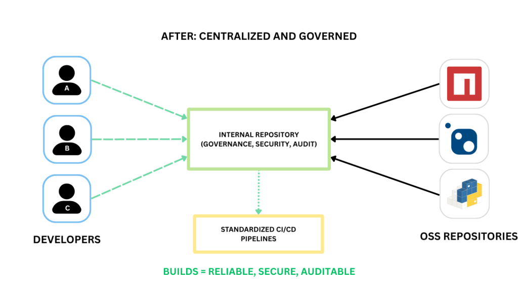 A central internal registry that allows your OSS to be pulled from proxy feeds means only vetted, application-approved packages end up in production, while preserving the speed and accessibility of your existing workflows.