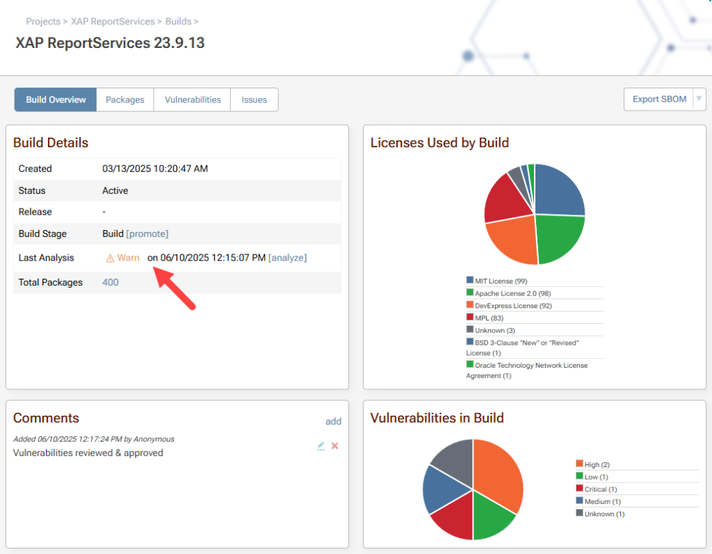 Auditing your OSS usage is easy with the ability to analyze your imported SBOMs, and a more visually friendly output of your build’s vulnerabilities and licenses is viewable from the Policies & SCA page.