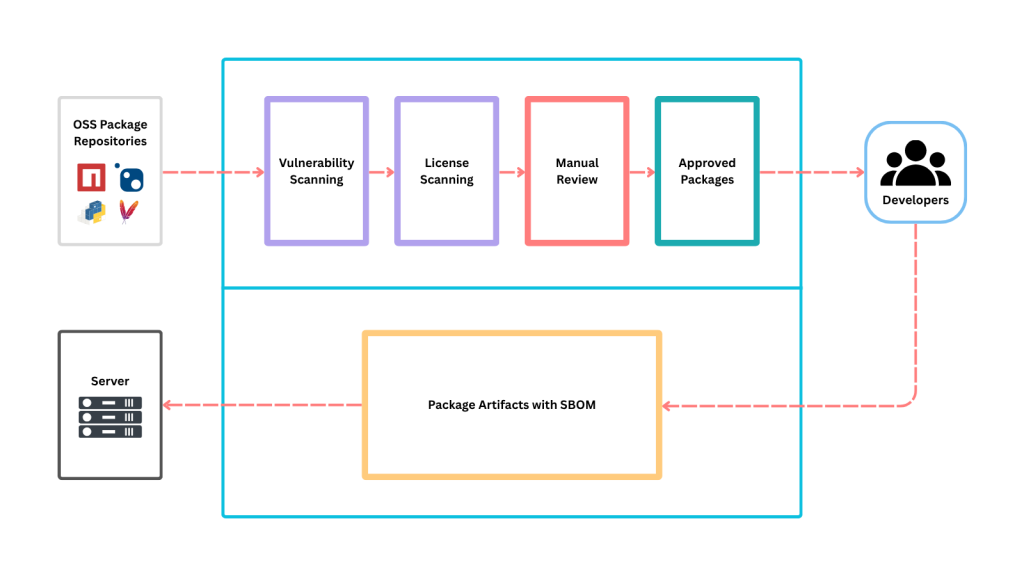✅ Package Approval Workflows: Centralized repositories use two distinct feeds: an unapproved feed that proxies OSS packages pending review, and an approved feed containing only vetted, production-safe packages. Packages go through a formal approval process before becoming available, ensuring thorough review without slowing down development. This setup ensures developers only access trusted packages that have been assessed and approved.