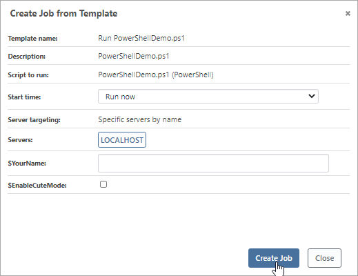 After creating the Job Template, you can use Otter to generate an input prompt (e.g., checkboxes, a text box, select-from list). This organizes the parameters for your PowerShell scripts into an accessible GUI executed as a job.