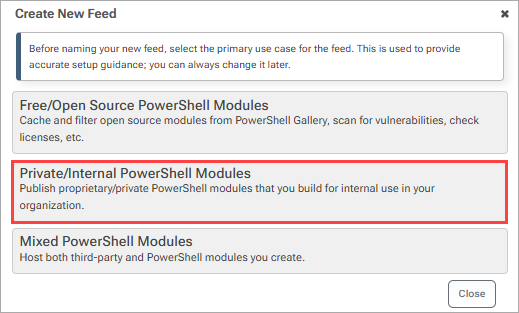 2. Choose “PowerShell Modules” and select “Private/Internal PowerShell Modules”, as we will be hosting private packages.
