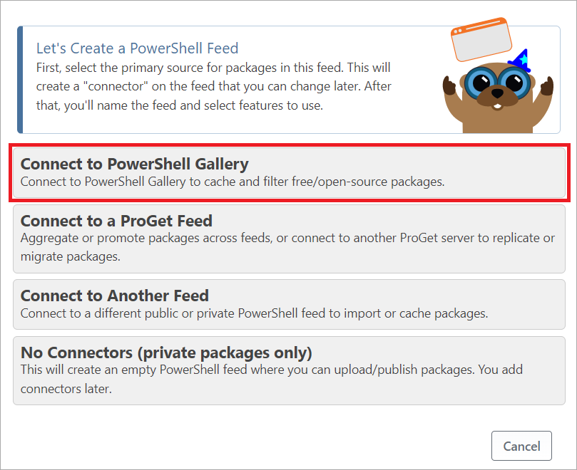 Navigate to “Feeds” and add a new PowerShell feed, selecting “Connect To Powershell Gallery”.