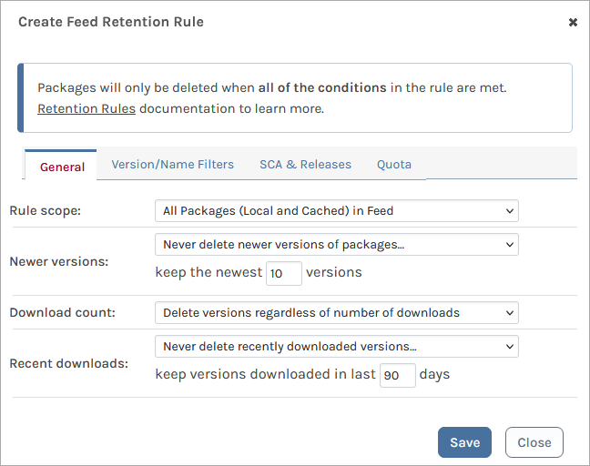 Retention Policies manage disc space in the same way as you would in Artifactory, and work with packages, assets, containers, and other ProGet features.