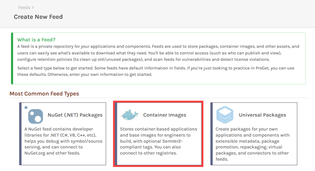 In ProGet users create “Feeds“; the equivalent to Artifactory’s Repositories. You can create any number of Docker Feeds in ProGet to act as Container Registries. These differ from regular feeds which contain packages. A Docker Feed acts as a registry that contains repositories, which in turn contain images.