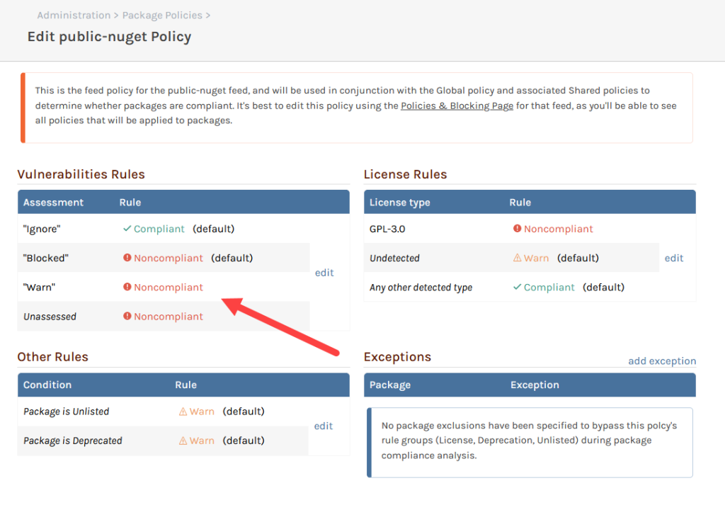 You can also set feed policies up alongside these. In the example below, we’ve set unassessed packages and packages assessed as “⚠ Warn” as “⚠ Noncompliant“, even though they are both configured as acceptable at a global level.