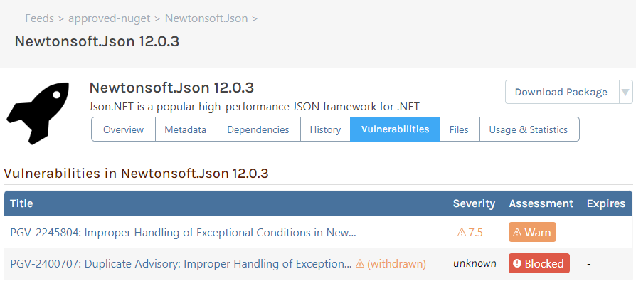 ProGet can either automatically assess package vulnerabilities or let you manually assess them yourself. You can also create “policies” to block “⚠ Noncompliant” packages.