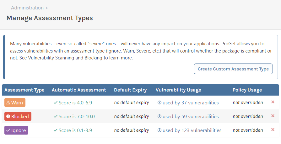 ProGet doesn’t limit assessment types based on CVS scores or Severity ratings. When you configure your vulnerability assessments, you can define your own types.