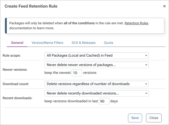 ProGet offers similar package retention policies, but it doesn’t use soft deletion, which can sometimes leave data in an unclear state and complicate automated cleanup. Instead, ProGet’s retention policies automatically move older packages to lower-cost storage while keeping them accessible.